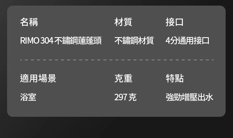 半小時前RIMO 304不鏽鋼增壓蓮蓬頭 - RIMO 304不鏽鋼增壓蓮蓬頭(團購五入組)NT$3599